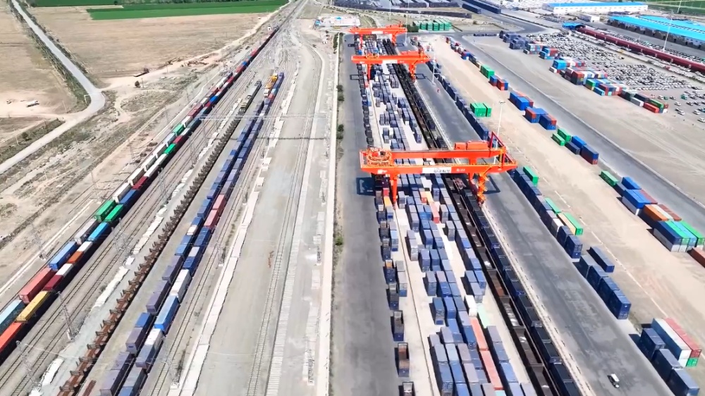 鸟瞰乌鲁木齐国际陆港区中欧班列集结中心。 (无人机航拍)(受访者提供)