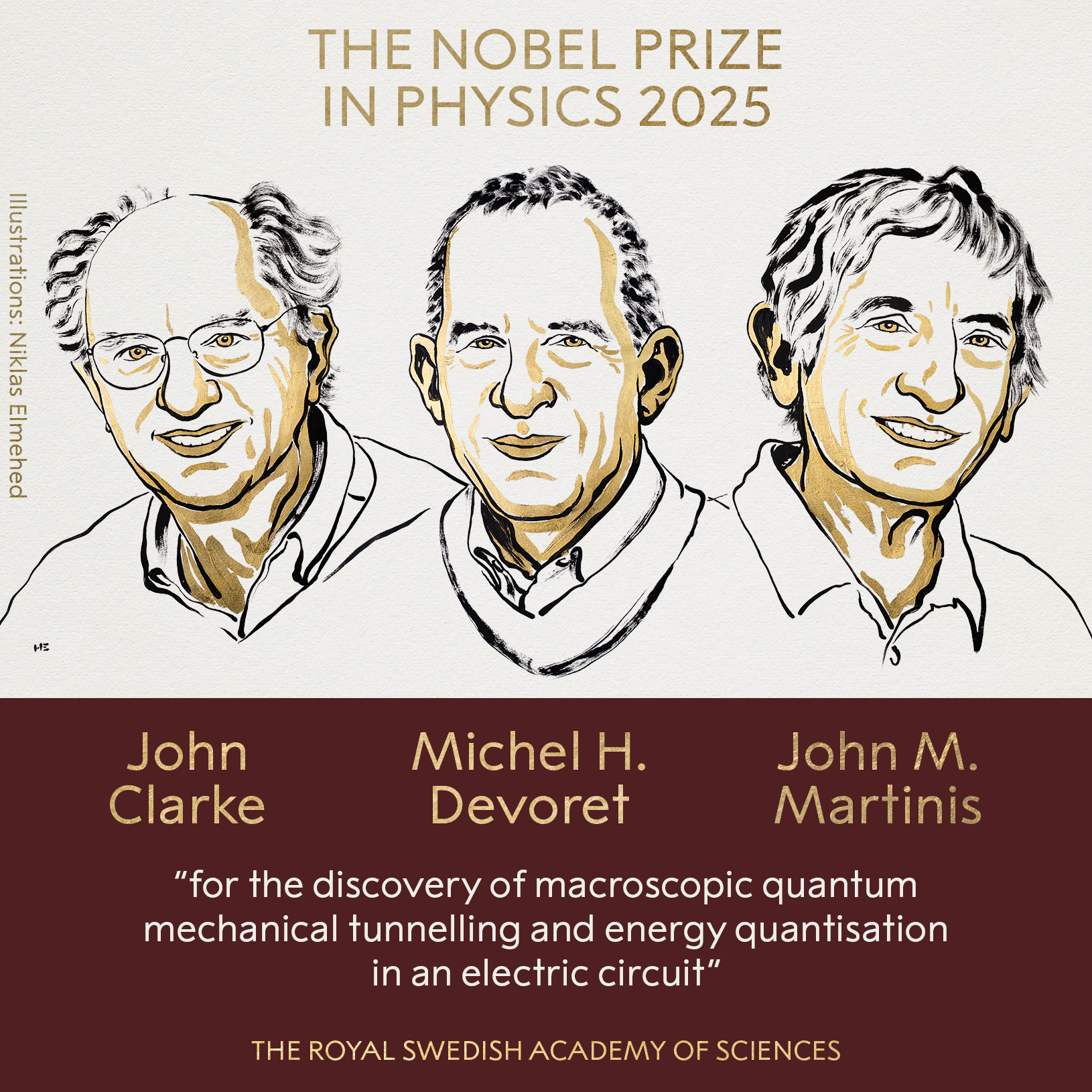 瑞典皇家科学院在7日宣布,诺贝尔物理学奖2025将被授予约翰·克拉克,米歇尔·H·德沃雷和约翰·M·马蒂尼斯,因为他们“发现了宏观量子机械隧道化的发现以及在通电机中的能量量化”。陪审团认为,通过一系列实验,获奖者表明,量子世界的奇怪特性可以在足够大的系统中进行,以握住它们。它的超导电气系统可以从一个状态传递到另一种状态,就像它穿过墙壁一样。他们还证明,该系统会吸收并排放一定程度的能量,如量子力学。