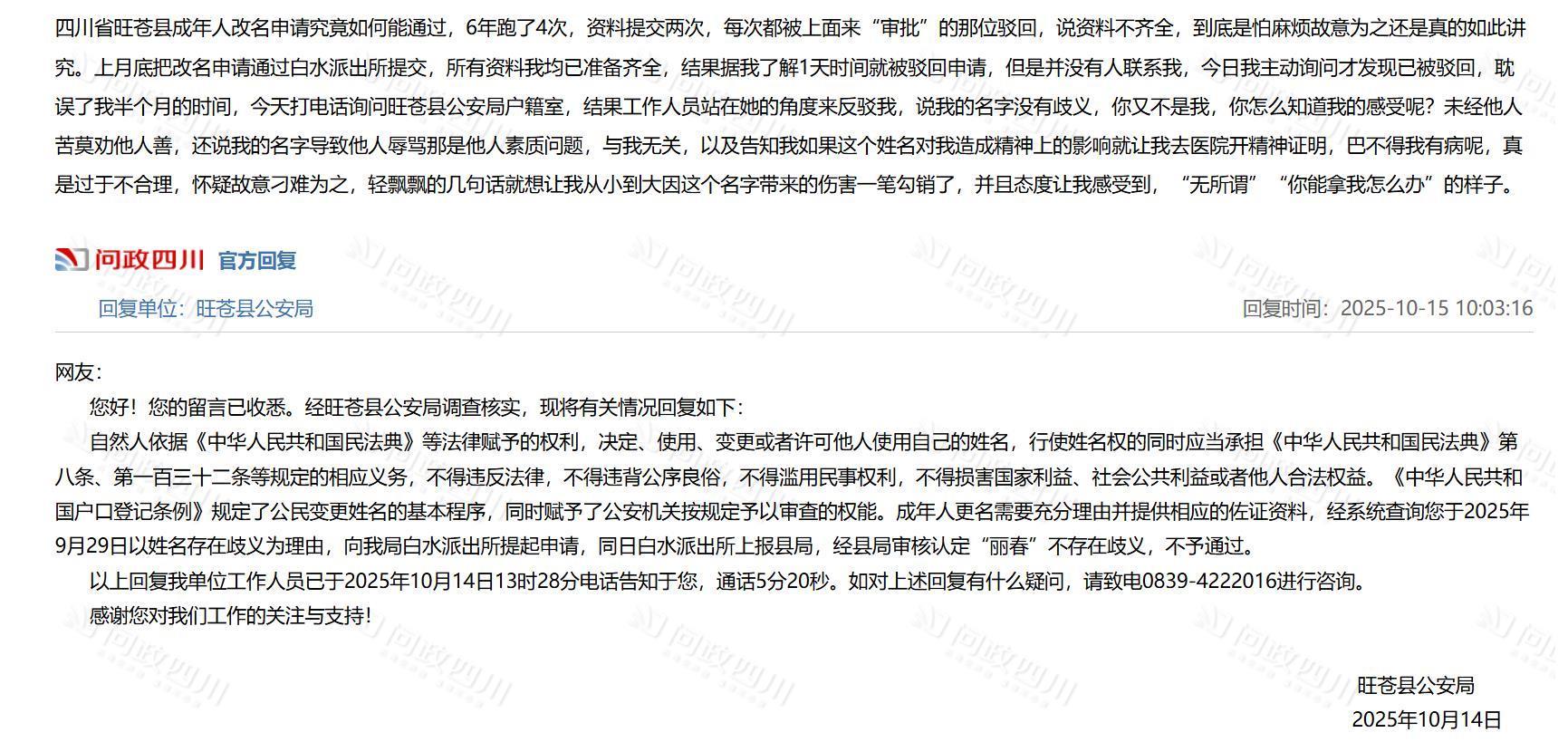 Ìå²ÙÐÂÎżÇÕßлï ½üÈÕ£¬Ò»Î»Ãû½Ð¡°Àî´º¡±µÄÍøÓÑÔÚÕþÑÐÆ½Ì¨Í¶Ë߳ƣ¬×Ô¼ºÊÇËÄ´¨Ê¡¹ãÔªÊÐÍú²ÔÏØ¹«Ãñ£¬ÏëÒªÉêÇë¸ÄÃû¡£ ¡°ÁùÄêÀïÎÒ³¢ÊÔÁËËĴΣ¬Ìá½»ÁËÁ½´ÎÐÅÏ¢¡±£¬µ«¶¼±»¾Ü¾øÁË¡£¸Ã¹«ÃñÔÚËß×´Öбíʾ£¬Ãû×ÖÎÊÌâ´ÓС¾ÍÈÃËûÊܵ½É˺¦¡£ ¡°Ä㣨Íú²ÔÏØ¹«°²¾Ö¹¤×÷ÈËÔ±£©²»ÊÇÎÒ£¬Ôõô֪µÀÎҵĸÐÊÜ£¿¡± 10ÔÂ15ÈÕ£¬Íú²ÔÏØ¹«°²¾Ö»ØÓ¦ÍøÓѳƣ¬×ÔÈ»È˰´ÕÕ¡¶ÖлªÈËÃñ¹²ºÍ¹úÃñ·¨µä¡·µÈ·¨ÂÉÈϿɵÄȨÀû×÷³ö¾ö¶¨¡¢ÐÐʹȨÀû¡£Èç¹ûÄúʹÓᢱä¸ü»òÕßÔÊÐíËûÈËʹÓÃÄúµÄÐÕÃû£¬ÄúÔÚÐÐʹÐÕÃûȨʱ»¹±ØÐë³Ðµ£¡¶ÖлªÈËÃñ¹²ºÍ¹úÃñ·¨¡·µÚ°ËÌõ¡¢µÚÒ»°ÙÈýÊ®¶þÌõ¹æ¶¨µÄÏàÓ¦ÒåÎñ¡£Ò»¶¨²»ÊÇÖÐÌáÇÙÎ¥·´·¨Âɹ涨£¬Î¥·´¹«¹²ÖÈÐòºÍµÀµÂ£¬ÀÄÓù«ÃñȨÀû»òÕßË𺦹ú¼ÒÀûÒæ¡¢Éç»á¹«¹²ÀûÒæ»òÕßËûÈ˺Ϸ¨È¨ÒæµÄ¡£ ¡¶ÖлªÈËÃñ¹²ºÍ¹ú»§¼®ÌõÀý¡·¹æ¶¨Á˹«Ãñ±ä¸üÐÕÃûµÄ»ù±¾³ÌÐò£¬²¢ÒÀ¾Ý¹æ¶¨¸³Ó蹫°²»ú¹ØÉó²éȨÏÞ¡£³ÉÄêÈ˱ØÐëÌṩ¸ü¸ÄÐÕÃûµÄ³ä·ÖÀíÓɲ¢ÌṩÊʵ±µÄÖ§³ÖÐÅÏ¢¡£¾ÏµÍ³²éѯ£¬2025Äê9ÔÂ29ÈÕ£¬ÒÔÐÕÃûÄ£ºýΪÓÉÏò°×ËçÅɳöËùÌá³öÉêÇ롣ͬÈÕ£¬°×Ë®¾¯²ìÊðÏòÏØÕþ¸®±¨¸æÁË´ËÊ¡£ÏØÌüÉó²é½á¹ûÈÏΪ£¬¡¶Á¢´º¡·²»´æÔÚÆçÒ壬Òò´Ë²»ÓèÅú×¼¡£ 11ÔÂ6ÈÕ£¬Íú²ÔÏØ¹«°²¾ÖÒ»Ãû¹ÙÔ±¸æËß¼ªÄ·ÐÂÎÅ£¬³ÉÄêÈËÆÕ±é²»ÔÊÐí¸ü¸ÄÐÕÃû¡£Èç¹ûÄúÐèÒª¸ü¸ÄÐÕÃû£¬Ôò±ØÐëÓÐÕýµ±ÀíÓÉ¡£Ã¿¸öÈ˵ÄÇé¿ö²»Í¬£¬ÔÒòÒ²²»Í¬¡£ÖÁÓÚÍøÃñ¶ÔÕþÖÎÎÊÌâµÄͶËߣ¬²»Ò˹«¿ª£¬ÒòΪÕâ»áÓ°Ïì¸öÈËÒþ˽¡£¾Ý¡¶ËÄ´¨ÈÕ±¨¡·±¨µÀ£¬Íú²ÔÏØ¹«°²¾ÖÏà¹Ø¸ºÔðÈ˱íʾ£¬¹«°²¾ÖÔÙ´ÎÁªÏµÍøÓÑ¡°Àî´º¡±£¬ÒªÇóËý²¹³äÒ½Ôº³ö¾ßµÄÏàÓ¦¾«Éñ²¡Ö¤Ã÷£¬ÒÔÖ¤Ã÷ËýµÄÔÃûÔì³ÉÁËËýµÄÐÄÀíºÍ¾«ÉñÉ˺¦¡£ÍøÓÑÌîдÐÅÏ¢ºó£¬¸ÄÃûÇëÇó»ñµÃÅú×¼¡£¼ÇÕß¶ÔÕþÖÎÑо¿Æ½Ì¨µÄ¸üÃûÒ²ÓÐÀàËÆµÄÒÉÎÊ¡£ÎÒ×¢Òâµ½ÁËÕâÒ»µã¡£ 2025Äê8Ô£¬ËÄ´¨ÀÖɽÊÐÃñÏòËÄ´¨Ê¡ÕþÐ×Éѯ¡£ËûµÄÃû×ÖÓë¡°Íò²Å¡±Ð³Òô£¬Òò´ËÔ⵽ͬʺÍÅóÓѵij°Ð¦¡£µ±¹ÙÔ±¸æËßËûÃû×Öʱ£¬ËûµÄµÚÒ»·´Ó¦ÊÇ¡°Íú²Æ¡±¡£ËûÒªÇó¸ÄÃû£¬ÒòΪÕâ¸öÃû×Ö¸øËûµÄ¹¤×÷ºÍÉú»î´øÀ´Á˼«´óµÄ²»±ã¡£ÀÖɽÊÐÎåͨÇŹ«°²¸æËßÍøÓÑ£¬¸ù¾Ý¹«°²²¿¡¶»§¼®¾ÓÃñÉí·ÝÖ¤£¨Ö¤Ã÷£©¹ÜÀí¹æ¶¨¡·[2021]µÚÊ®¶þÌõµÚÎåÊ®ÈýÌõ¹æ¶¨£¬¹«Ãñ°´ÕÕ·¨ÂɺÍÕþÖÎÒªÇóÉêÇë±ä¸üÐÕÃûʱ£¬±¾ÈË»òÕ߼໤È˱ØÐëÏò¼ÒÍ¥»§¿ÚËùÔڵع«°²ÅɳöËùÌá³öÊéÃæÉêÇ룬²¢¸½ÉÏÊéÃæÇëÇóºÍÏà¹Ø²ÄÁÏ¡£ÈçÐè±ä¸üÐÕÃû£¬¿ÉÒÔµ½µ±µØÅɳöËùÉêÇë±ä¸ü¡£¾¯·½»ØÓ¦µ±Íí£¬ÍøÓÑÔÚÕþÑÐÆ½Ì¨ÆÀÂÛµÀ£º¡°¸ÐлÁìµ¼Åú×¼ÕâÒ»ÇëÇ󡣡±µ±Ê±£¬Ò»Ãû¾¯¹Ù±íʾ£¬»¥ÁªÍøÓû§¿ÉÒÔÒªÇó¸ü¸ÄÐÕÃû¡£ ¡°ÑŸ󡰸ù¾Ý¹æ¶¨£¬ÉêÇëÈËÔÚûÓÐÐÌʰ¸¼þ¡¢ÐÅÓñ¨¸æÃ»ÓÐÎÊÌâµÄÇé¿öÏ£¬¿ÉÒÔ¸ÄÃû¡£¡±´ËÍ⣬ËÄ´¨Ê¡´ïÖÝÊС¢¼òÑôÊй«°²¾ÖµÄ¹ÙÔ±Ò²¹«²¼ÁËÉêÇë¸ÄÃûµÄÁ÷³Ì¡¢Ìõ¼þºÍÌáʾ¡£ÎÄÖУ¬Á½¹ú¾¯·½¶¼¾¯¸æËµ£¬18ËêÒÔºó¸ÄÃûÓкܶà±×¶Ë£¬·Ç±ØÒª²»Òª¸ÄÃû¡£Èç¹û¸ÄÃû²»Î¥·´¹«¹²ÖÈÐòºÍµÀµÂ£¬¶øÇÒ¸ÄÃûÀíÓɲ»Ç¡µ±£¬¹«°²»ú¹Ø»áÏò¹«°²»ú¹ØÍ¨±¨¡£±±¾©Ë¼ÂÔÂÉʦÊÂÎñËù£¨ÄϾ©£©ÖìÑ©ÂÉʦָ³ö£¬¸ù¾ÝÎÒ¹ú¡¶Ãñ·¨µä¡·µÚ1012Ìõ¹æ¶¨£¬×ÔÈ»ÈËÓÐȨ±ä¸üÐÕÃû£¬µ«ÍøÃñÒªÇó±ä¸üÐÕÃûµÄÐÐΪ£¬Ö»Òª²»Î¥·´¹«¹²ÖÈÐò£¬¾ÍÓ¦µ±²»Î¥·´¹«¹²ÖÈÐòºÍµÀµÂ¡£ßÀºÍµÀµÂ¡£Õþ¸®»ú¹¹²»Ó¦ÒòÔÃû¡°Àî´º¡±Ã÷È·¶ø¾Ü¾ø¸ü¸ÄÃû³Æ¡£·ñÔò£¬½«ÉæÏÓÇÖ·¸»¥ÁªÍøÓû§µÄÐÕÃûȨ¡£ÖìÑ©±íʾ£¬¹«°²¾ÖËæºóÒªÇóÍøÓѲ¹³äÒ½Ôº³ö¾ßµÄÏà¹Ø¾«Éñ²¡Ö¤Ã÷ÒÔÖ¤Ã÷ÆäÔÃûÔì³ÉÐÄÀíÇé¸ÐÉ˺¦µÄÐÐΪûÓз¨ÂÉÒÀ¾Ý£¬ÉæÏÓ¶ÔÍøÃñ½øÐÐÈËÉíÎêÈè¡£»¥ÁªÍøÓû§¿ÉÒÔ×ÔÓɸü¸Ä×Ô¼ºµÄÐÕÃû¡£Ö»Òª±¾ÈËÔ¸Òâ¸Ä±ä£¬ÇҸıäµÄ·½Ê½²»Î¥·´¹«¹²ÖÈÐòºÍµÀµÂ£¬ÐÐÕþ»ú¹Ø¾ÍÓ¦¸ÃÅäºÏ¸Ä±ä£¬¶ø²»ÊÇÔÚûÓз¨ÂÉÒÀ¾ÝµÄÇé¿öÏ´´ÔìǰÌáÌõ¼þ£¬×èÖ¹»¥ÁªÍøÓû§ÐÐʹ¹ÚÃûȨ¡£